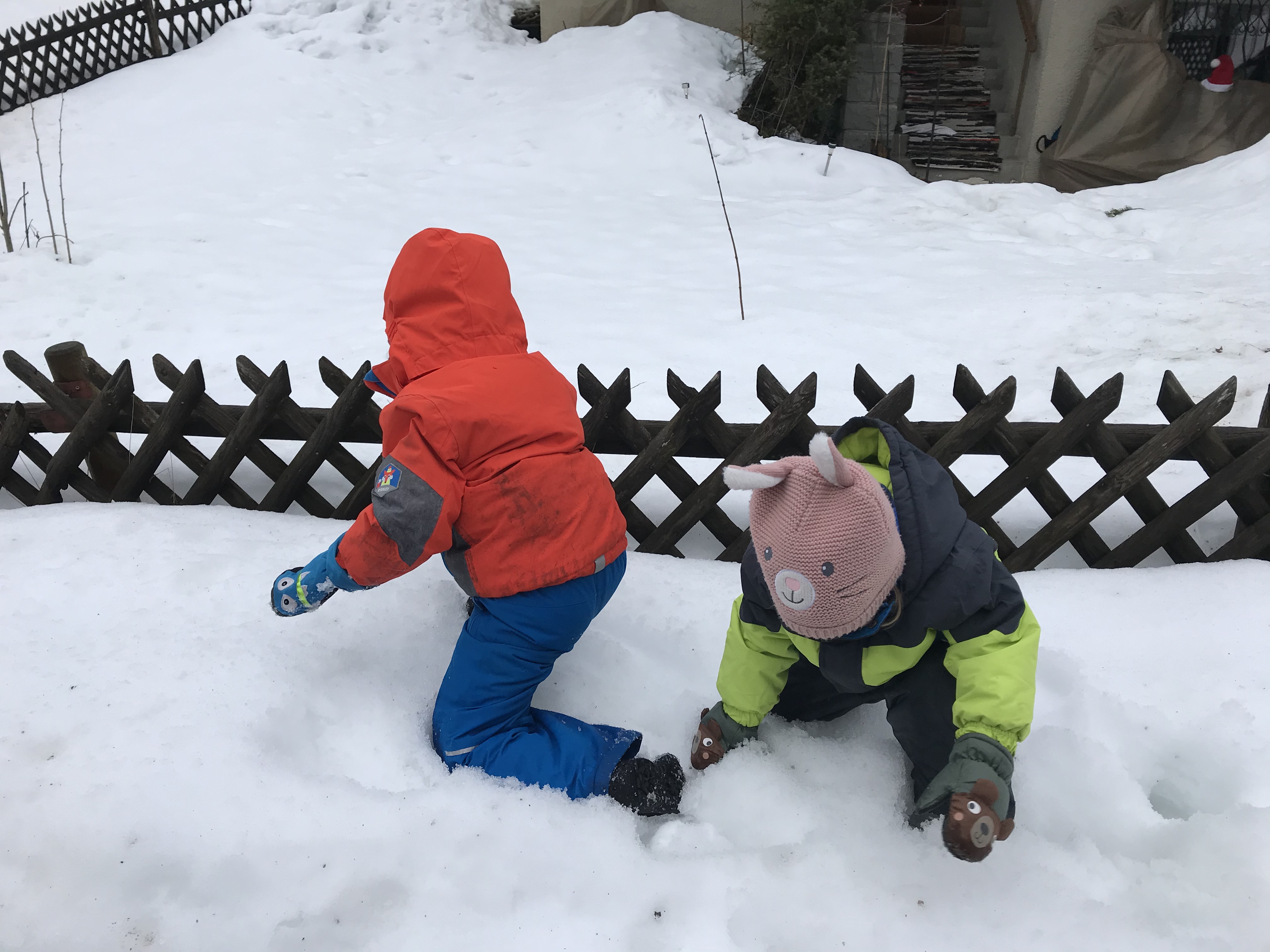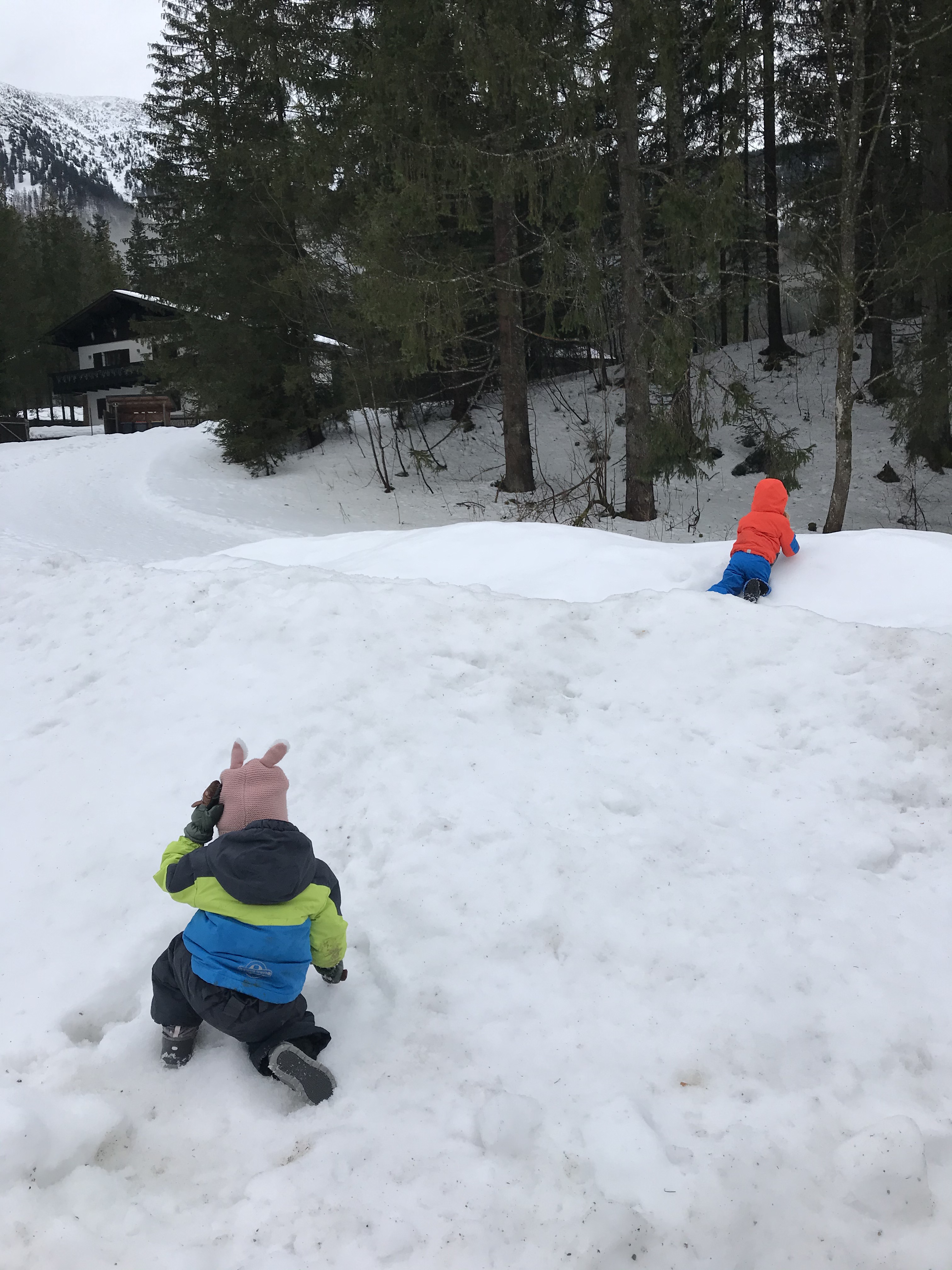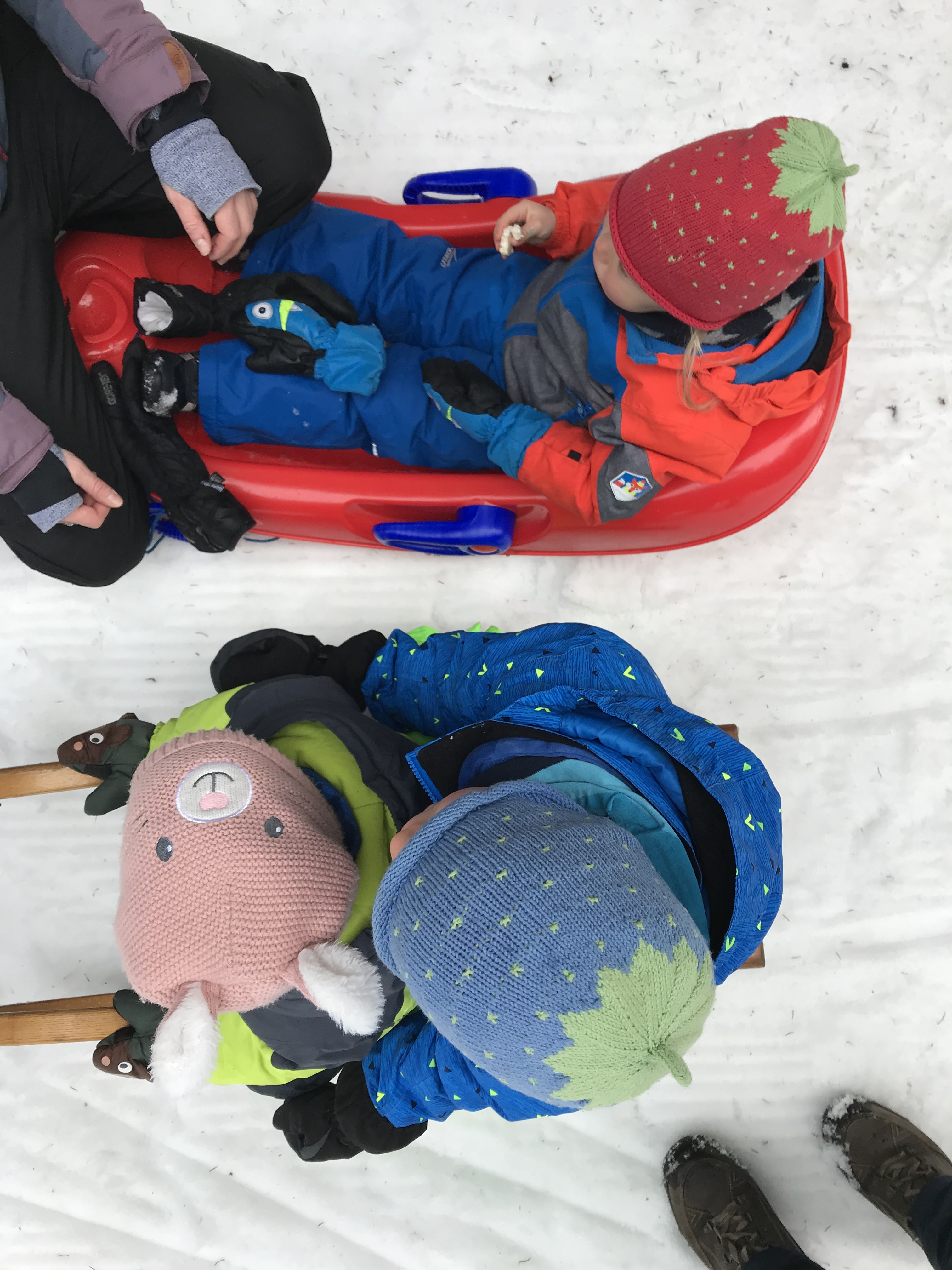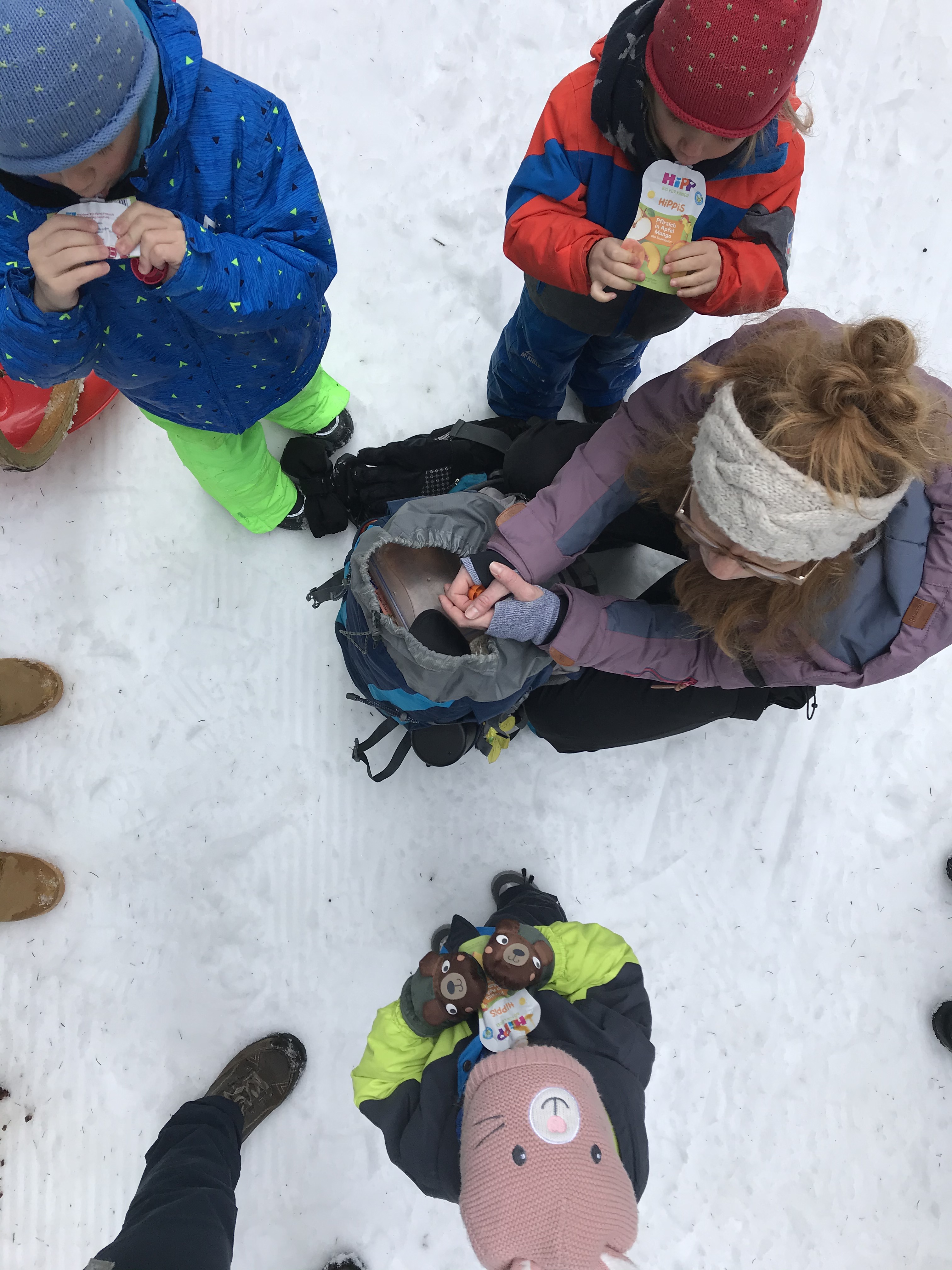 Nach anfänglichen Parkplatzschwierigkeiten in Lackenhof sind wir dann direkt bei der Ötscherwiese fündig geworden. Dort befindet sich ein großes Langlaufzentrum und es gibt eine gute Auswahl an freien Parkplätzen – zumindest unter der Woche. Kaum ausgestiegen lagen schon alle 3 „Natuakinda“ im Schnee – gibt ja nichts Schöneres und zuhause in der Stadt ist er ja leider schon längst geschmolzen. Einige Zeit hatten wir Bedenken ob wir uns überhaupt mehr als 100 Meter vom Auto wegbewegen würden, weil die „Schneeberge“ am Straßenrand für unsere Wilden einfach viel zu verlockend waren und Zeter und Mordio folgten als wir zum Weitergehen animieren wollten. Aber gut…. wir kennen das ja schon und im Anspornen und Motivieren haben wir „Natuamamas“ ja zum Glück schon viel Übung. Bald saßen alle 3 auf Rodel und Bob und waren rundum zufrieden mit der Gesamtsituation. Die Natuapapas fungierten als Zugtiere und wir Mamas konnten die winterliche „Natua“ genießen, plaudern und Fotos machen. Herz was willst du mehr?!