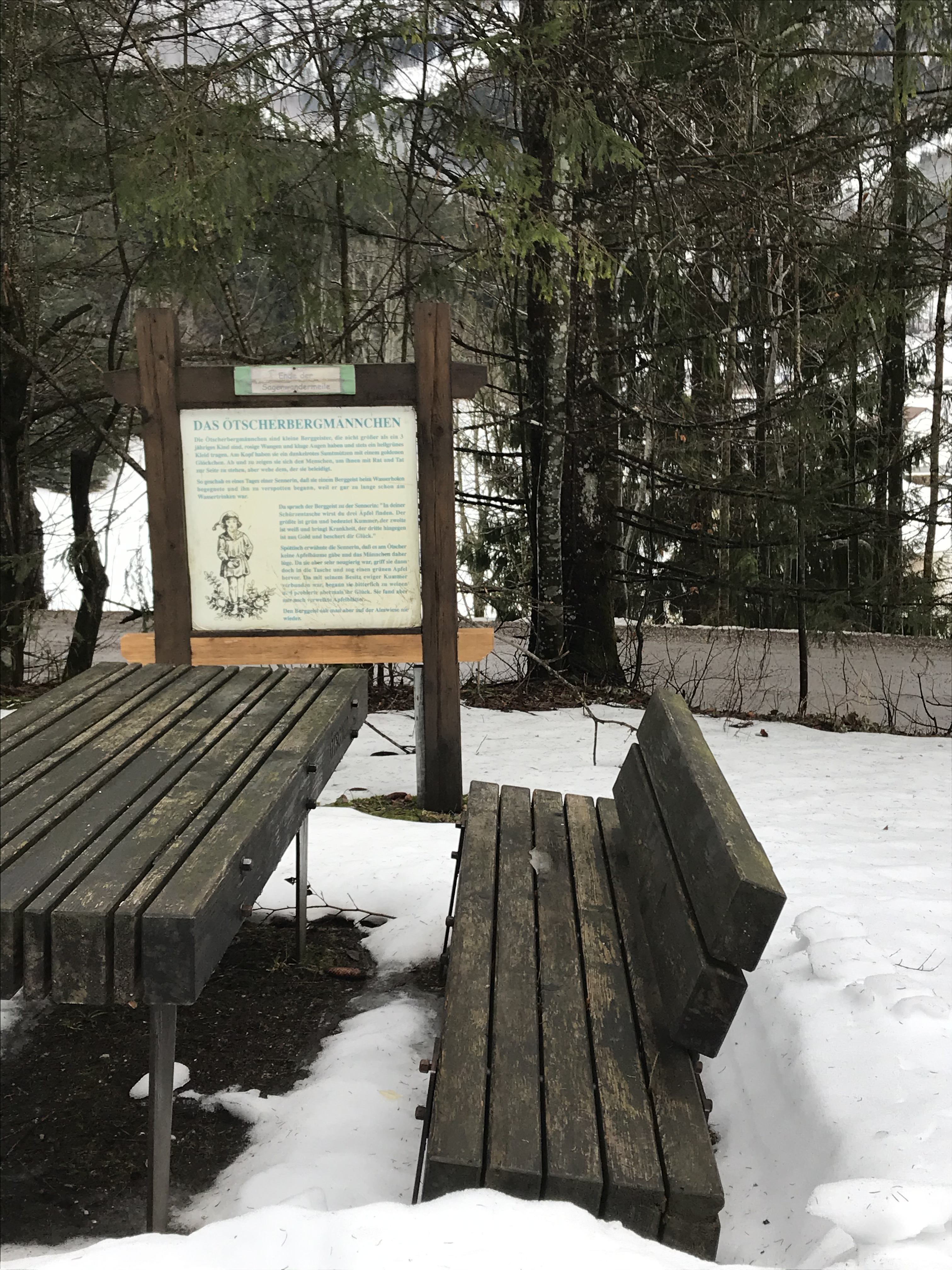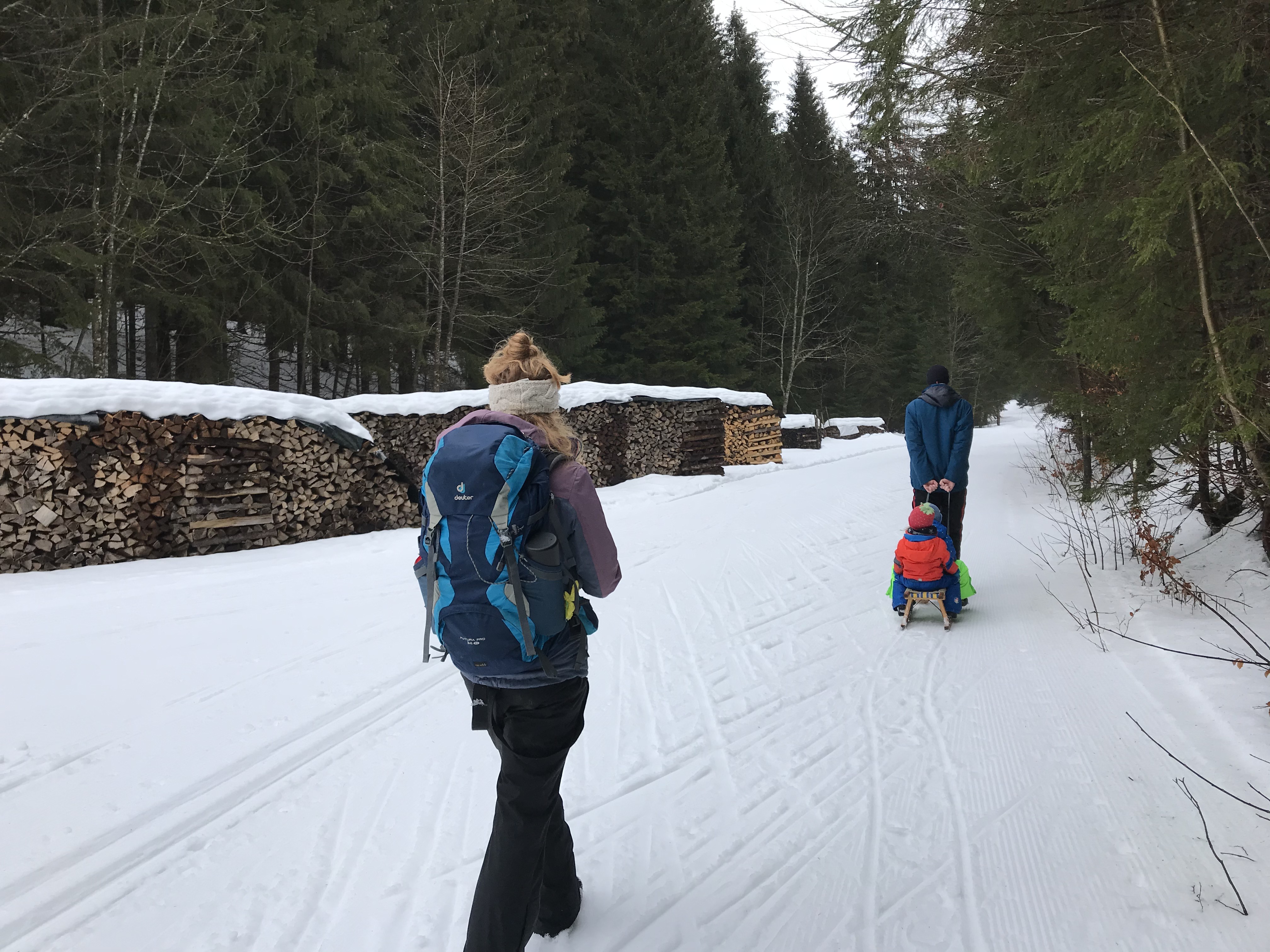 Als wir dann bei der kleinen Waldkapelle und zugleich Weggabelung ankamen, waren wir uns plötzlich nicht mehr sicher, ob wir wirklich den Winterwanderweg Mandlboden gehen sollten. Dieser war nämlich auf der Wanderkarte vor Ort lediglich als Schneeschuhweg Kesselgraben gekennzeichnet und sah nicht besonders einladend aus. So entschieden wir uns für die 1er Langlaufroute „An der Gmoa“. Es waren einige Langläufer unterwegs, aber es störte niemanden, dass wir den Rand der Loipe einnahmen und wir freuten und riesig über so gut präparierte Wege, wo es einfach war Rodel und Bob mit menschlichem Gepäck zu ziehen. Der Weg führte fast durchgehend durch den Wald, war nicht besonders steil und wirklich gut zu begehen. Aus einem ursprünglich geplantem kurzen Spaziergang wurde jedoch eine 2,5-Stunden-Wanderung und so fielen die beiden Kleinen gegen Ende völlig erschöpft in einen Dornröschenschlaf. Der Rest der Truppe stärkte sich noch schnell bei einer mitgebrachten Jause (direkt bei der Ötscherwiese gibt es ein Jausenbankerl und auch öffentliche Toiletten) bevor auch noch die Stimmung des 3. „Natuakindes“ zu kippen drohte und wir uns wieder auf den Heimweg machten.