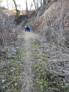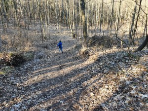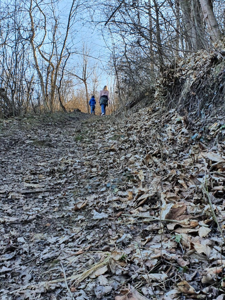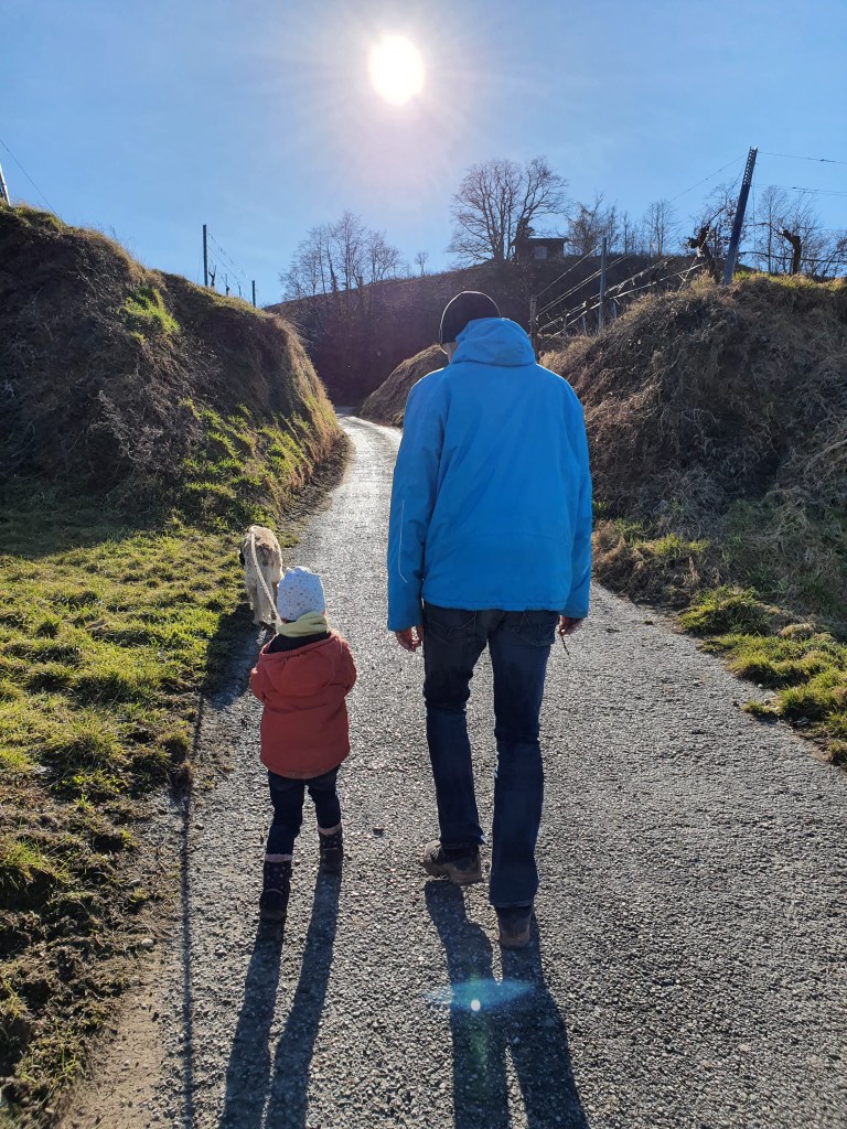 Wir halten uns rechts, der Pfad wird immer breiter und mündet schließlich in einen mit Laub bedeckten Weg. Wir sind wieder völlig allein. Wer sich hier nicht auskennt, sollte nicht die Orientierung verlieren, denn jetzt geht es ohne Beschilderung bergab. Eigentlich geht es immer nur gerade aus. Der Weg führt am Ende serpentinenhaft nach unten. An einer T-Kreuzung gehen wir rechts wieder Richtung Weingarten. Zuerst gerade, dann links Richtung Hollenburg hinab. Immer querfeldein durch die Weingärten, bis wir wieder zu dem Punkt gelangen, an welchem wir von der Kirchengasse heraufgekommen sind. Mit vielen unterhaltsamen Spielchen legt unser 5-jähriger Natuabursche den gesamten Weg zu Fuß zurück. Die Dreijährige gibt schließlich auf und macht es sich auf Papas Schultern bequem.