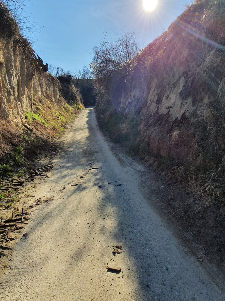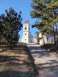 Die Sonne strahlt uns ziemlich kräftig entgegen. Endlich zieht der Frühling ins Land. Gut gelaunt biegen wir rechts ab, überqueren eine Kreuzung und finden uns zwischen hohen Lösswänden wieder. Ich liebe diese urigen Hohlwege zwischen den Weingärten. Wieder biegen wir links ab und gelangen auf die Wetterkreuzstraße. Achtung! An schönen Tagen wie heute fahren hier doch auch einige Autos herum. Nicht jeder ist gewillt den „Berg“ aus eigener Kraft zu bezwingen. Wir folgen der Straße ein paar Biegungen und haben nun ganz klar unser Ziel vor Augen: die Wetterkreuzkapelle in voller Sonnenpracht.