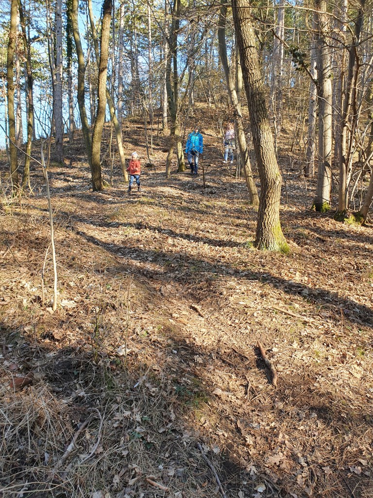 Die Straße mündet in eine Forststraße, welche wir entlang marschieren. Rechterhand zweigt ein steiler Pfad ab, welchen wir uns tapfer hinaufkämpfen. Das Natuamäderl will nicht mehr. Gemächlich mit vielen Ablenkungsgeschichten schafft sie es aber doch bis nach oben. Wir sind mächtig stolz auf unsere Natuakinda. Ganz allein sind sie bis hinaufmarschiert. Ein bisschen verärgert über die vielen Sonntagsausflügler gehen wir ans hintere Ende der Kapelle, wo ein wirklich steiler, wurzeliger, schmaler Pfad hinab in den Wald führt.