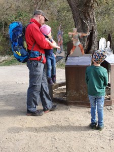 Der Plan ging heute voll auf. Wir starten am frühen Vormittag von St. Pölten aus und kommen gegen 10 Uhr in Dürnstein an. Unser Auto lassen wir gleich am ersten Parkplatz vor dem historischen Städtchen zurück und spazieren gen Stadttor. Die Natuakinda sind ganz aufgeregt: „Papa, Mama! Eine Burg! Habt ihr die Burg gesehen? Da gehn wir rauf? Los schnell Papa, komm!“ Vor dem Stadttor müssen wir gleich wieder einen Stopp einlegen. Unser Natuabursche entdeckt das bemalte Schild mit der Geschichte von Richard Löwenherz. Die muss jetzt einmal vorgelesen werden. Ein paar Meter weiter dann die Geschichte über seinen Vater Heinrich ll und seine, für damalige Verhältnisse sehr politische Mutter Eleonore von Aquitanien. Die Begeisterung meines Sohnes ist entfacht. Wow – so viele tolle Geschichten! Endlich sind wir mit den Schildern durch. Auf geht’s in die Stadt hinein. Gleich rechts führt uns ein steiler Weg nach oben. Der Weg ist auch unter „Eselsteig“ bekannt. Ein Schild weißt auf eine Wanderdauer von 20 Minuten hin. Es wird darauf hingewiesen, den Weg nur mit gutem Schuhwerk zu besteigen.