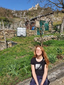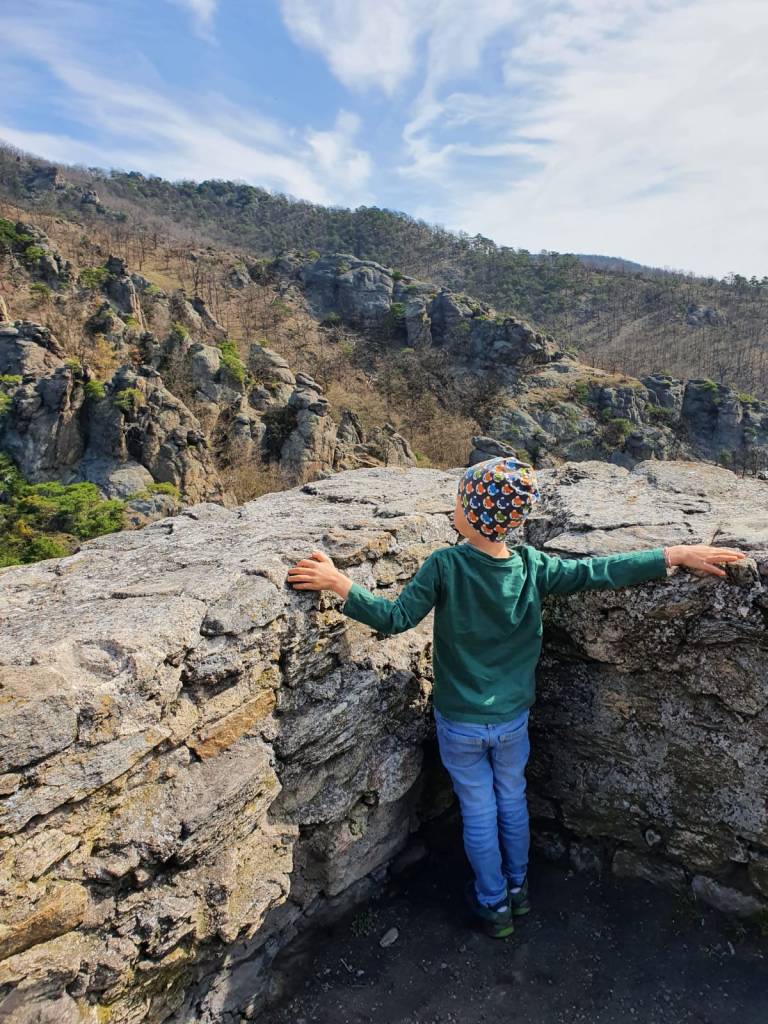 Es geht steil nach oben. Die Treppen sind für unsere Natuatochter doch sehr hoch. Sie meistert sie aber bravourös. Ständig will ich ihr zur Hilfe eilen, werde aber mit einem selbstbewussten „Nein, ich kann das alleine“ zurückgepfiffen. Auf Grund des teilweise abschüssigen Gelände geht mein Mann mit dem Natuaburschen vor, während ich beim Natuamädl bleibe. Heute gibt es keinen Pausenfüssler. Beide steigen flotten Schrittes den Berg hinauf. Der Sohnemann hält uns zur Eile an. Wir sollen endlich schneller gehen. Er wolle jetzt zur Burg. Dennoch versuche ich immer wieder einmal inne zu halten um die wunderbare Aussicht auf die Stadt, die umliegenden Weingärten, die Donau und die Marillenblüte zu genießen. Das Wetter ist traumhaft. Die Sonne strahlt, der Himmel glänzt. Am Wegesrand entdecken wir Himmelschlüssel und wilde Stiefmütterchen. Eine Eidechse huscht vor uns ins Unterholz. Es fühlt sich so an, als würde die gesamte Natur um uns die Frühlingssonne mit einem Freudenfest begrüßen.