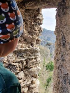Nach etwa 25 Minuten kommen wir bei der Burgruine an. Der Ausblick ist heute auf Grund des Wetters besonders schön. Die Natuakinda gehen sofort auf Entdeckungstour. Wir versuchen sie nicht aus den Augen zu lassen. Wieder einmal bin ich froh, dass wir so geschickte Kinder haben. Das Kinderturnen, der Kletterkurs, die vielen Erlebnisse in der Natua zeigen ihre Wirkung. Ich habe das Gefühl meinen beiden Natuakindern auch im abschüssigen Gelände vertrauen zu können. Natürlich lassen wir sie nicht aus den Augen, aber ich finde es toll sie dabei beobachten zu können, wie sie die Natua bestaunen, jeden Felsen beklettern und jeden Pfad testen. Wir jausnen am zweithöchsten Punkt, den wir finden können. Der höchste ist leider bereits besetzt 🙂