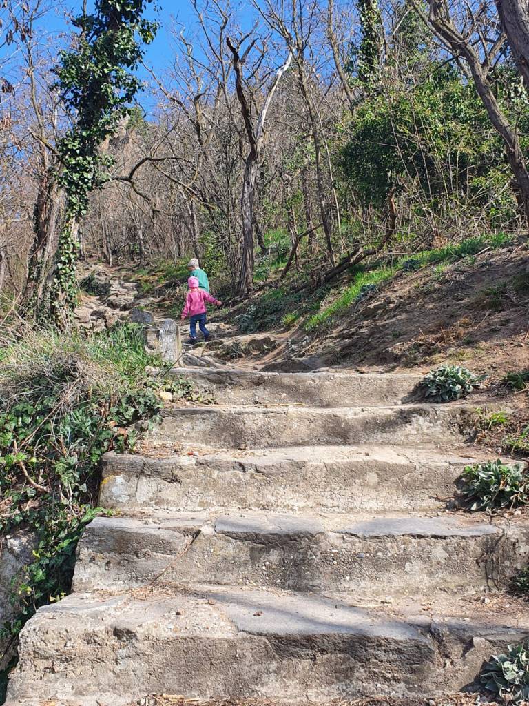 Wegbeschaffenheit: Der Aufstieg am Eselsteig ist ziemlich steil, vor allem die Steinstufen sind sehr hoch, meine Tochter ist 1 Meter groß und hat den Weg dennoch leicht allein zurückgelegt. Nicht kinderwagentauglich.