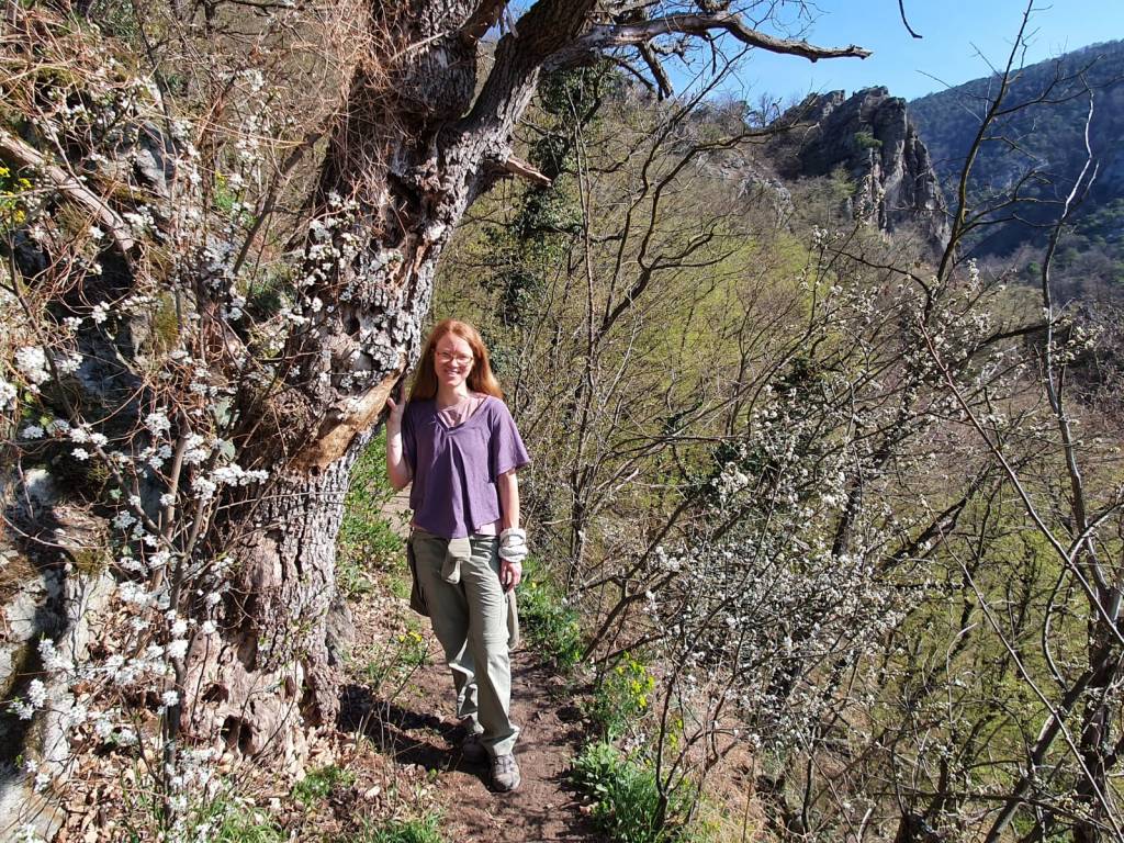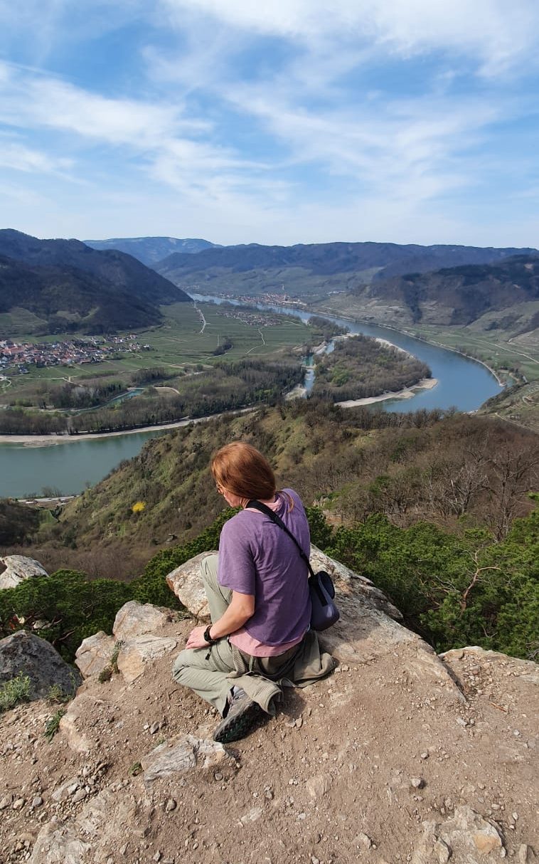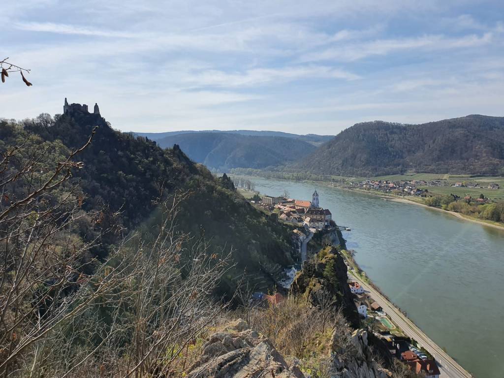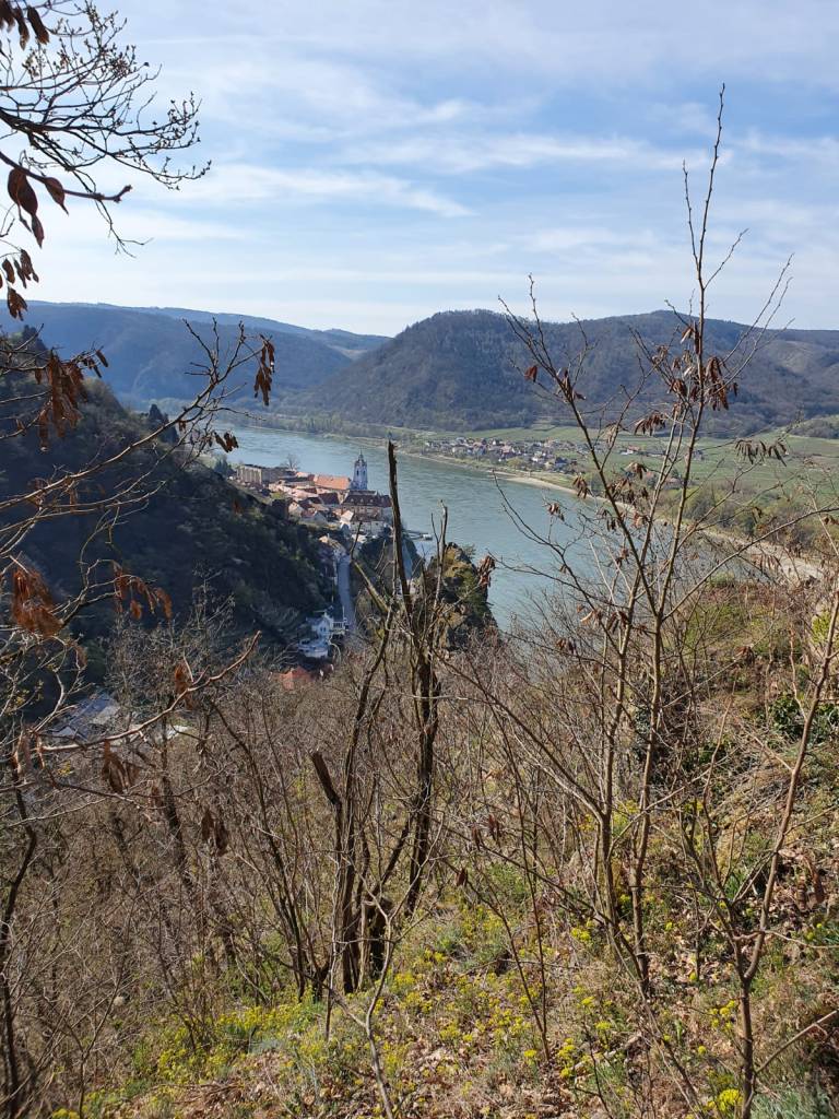 Schon lange schwebt mir der Vogelbergsteig bei Dürnstein durch den Kopf. Für die Natuakinder ist das aber noch nichts. Der Weg ist zu lang, zu steil und zu abschüssig. Außerdem will Mama endlich einmal wieder ihr eigenes Tempo gehen. Irgendwann muss man auch Mal egoistisch sein und sich selbst ins Zentrum rücken. Kurzerhand geben wir also die Kinder bei den Großeltern ab und machen uns auf den Weg nach Dürnstein in der Wachau. Wir haben Glück und das Wetter spielt ebenfalls mit. Wir lassen das Auto am Parkplatz vor dem Tunnel rechts zurück, spazieren mit leichtem Gepäck durch die Dürnsteiner Altstadt und gelangen so in den Talgraben. Der Vogelbergsteig führt links den Berg hinauf. Von Beginn an sind wir nicht allein. Etliche Wandersleut haben denselben Weg heute vor sich. Es herrscht ein gemütliches Treiben auf dem Weg, welches aber nicht unangenehm ist. Jeder geht sein eigenes Tempo. Immer wieder zweigen schmale Pfade vom Steig ab und enden in traumhaften Aussichtspunkten mit Blick auf die Ruine oder hinab zur Donau. Der Frühling ist nun gänzlich am Erwachen. Überall um uns spürt man förmlich, wie die Natur sich der Sonne entgegenstreckt.