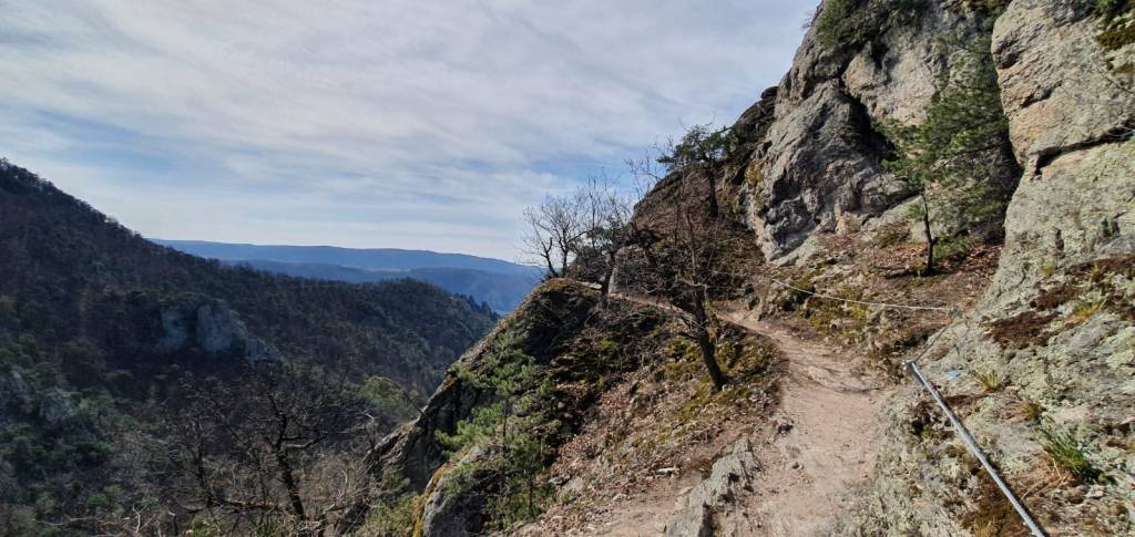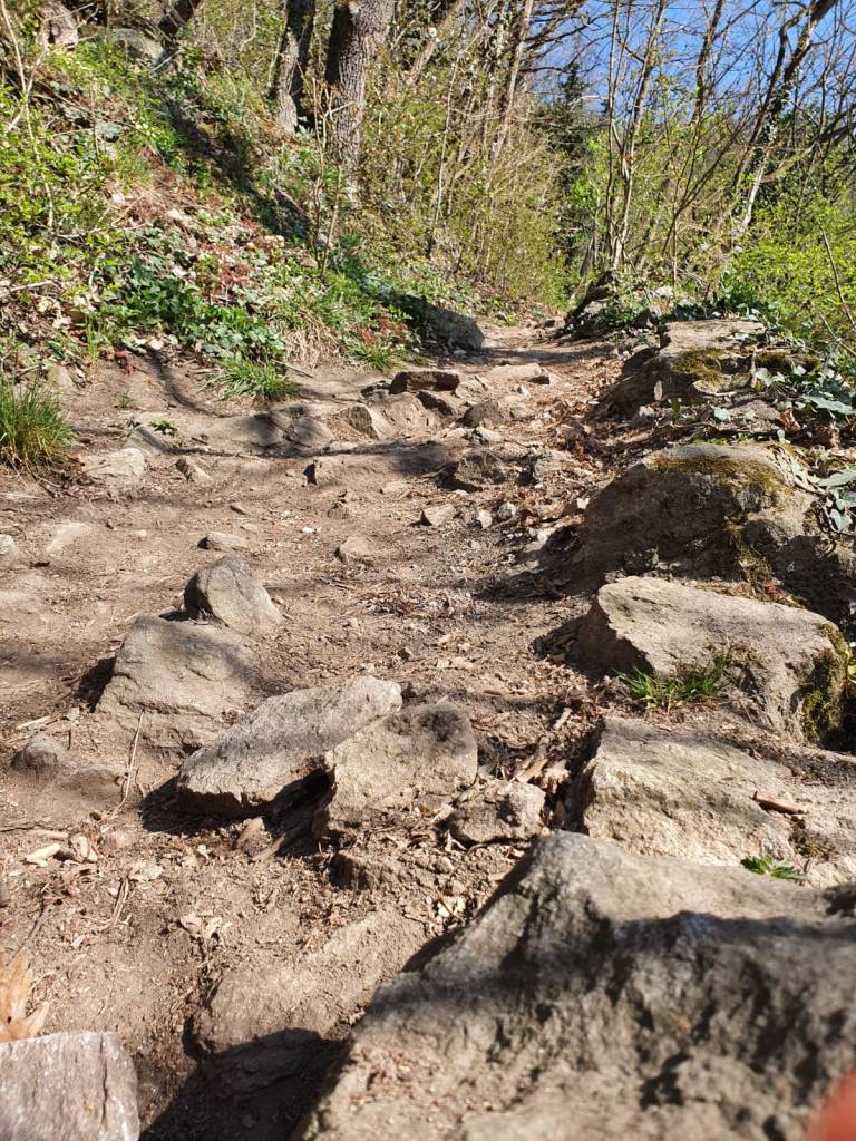 Wegbeschaffenheit: zu Beginn schmaler, steiniger, bewurzelter Pfad, oben gehts einen steinigen, teils felsigen Kamm entlang, oft sehr abschüssig, streckenweise mit Drahtseilen gesichert