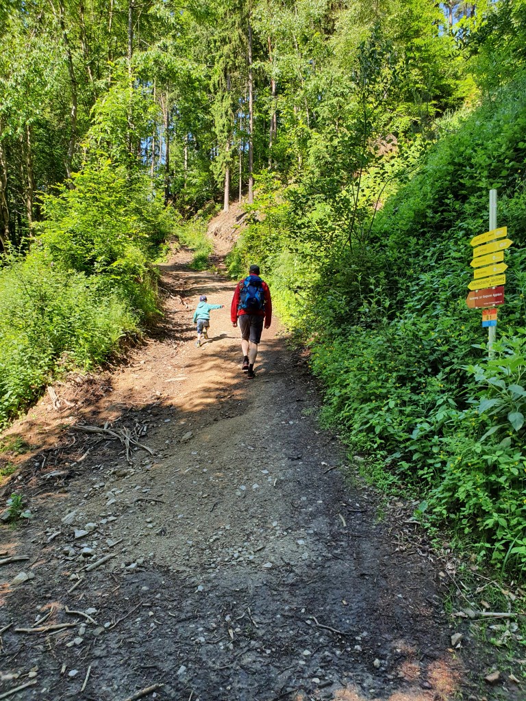 Am besagten Tag machen wir uns also mit dem Auto auf den Weg nach Maria Langegg. Das Wetter ist wirklich herrlich und der Weg wirklich gut beschildert und zu gehen. Die kleine Natuatochter ist natürlich wie immer nicht sonderlich begeistert, wenn es darum geht sich die Beine zu vertreten, aber mit genügend Jause und Wanderspielen lässt sie sich dann doch davon überzeugen. Die Strecke nach Aggstein verläuft wirklich sehr gemütlich.