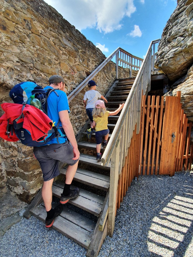Nach etwa einer Stunde Wegzeit kommen wir bei der Burgruine an. Was wir oder besser ich nicht bedacht habe, ist der Umstand, dass man in einer solchen Ruine bei der Besichtigung auch einige Meter zurücklegt. Stiegen also hinauf, wieder hinunter, eine weitere Treppe rauf und wieder runter. Die wirklich herrliche Aussicht in die Wachau genießen, das Kellerverließ bestaunen, das volle Programm. Nach zweistündiger, intensiver Besichtigung verlassen wir schon etwas erschöpft die Burg. Wie gerne würden wir uns nun in ein Auto setzen und nach Hause fahren. Aber nix da … jetzt muss noch der Weg zurück nach Maria Langegg bezwungen werden. Weder wir noch die Kinder sind begeistert, aber was soll man machen? Wir Eltern lächeln und machen das Beste aus der Sache, was so viel heißt wie Mama und Papa tragen die Kinder zum Auto. Der Natuajunge ist wie immer noch voller Kraft. Den größten Teil des Weges legt er hopsend selbst zurück. Klettert immer wieder mal eine Böschung hinauf und hinunter, raschelt durch das Laub, erzählt unzählige Rittergeschichten und fragt Papa bezüglich Mittelalter ein Loch in den Bauch.