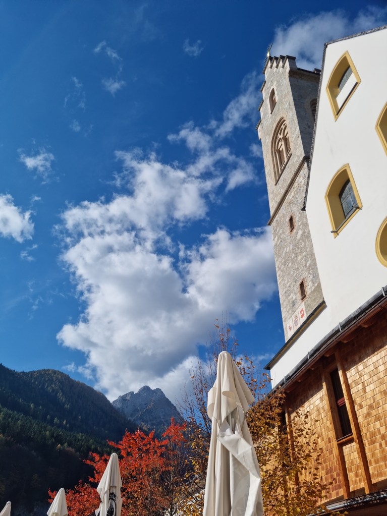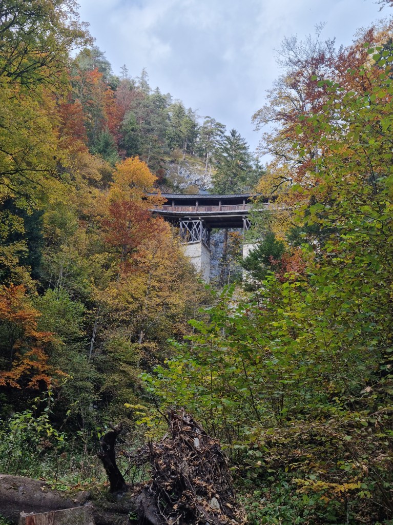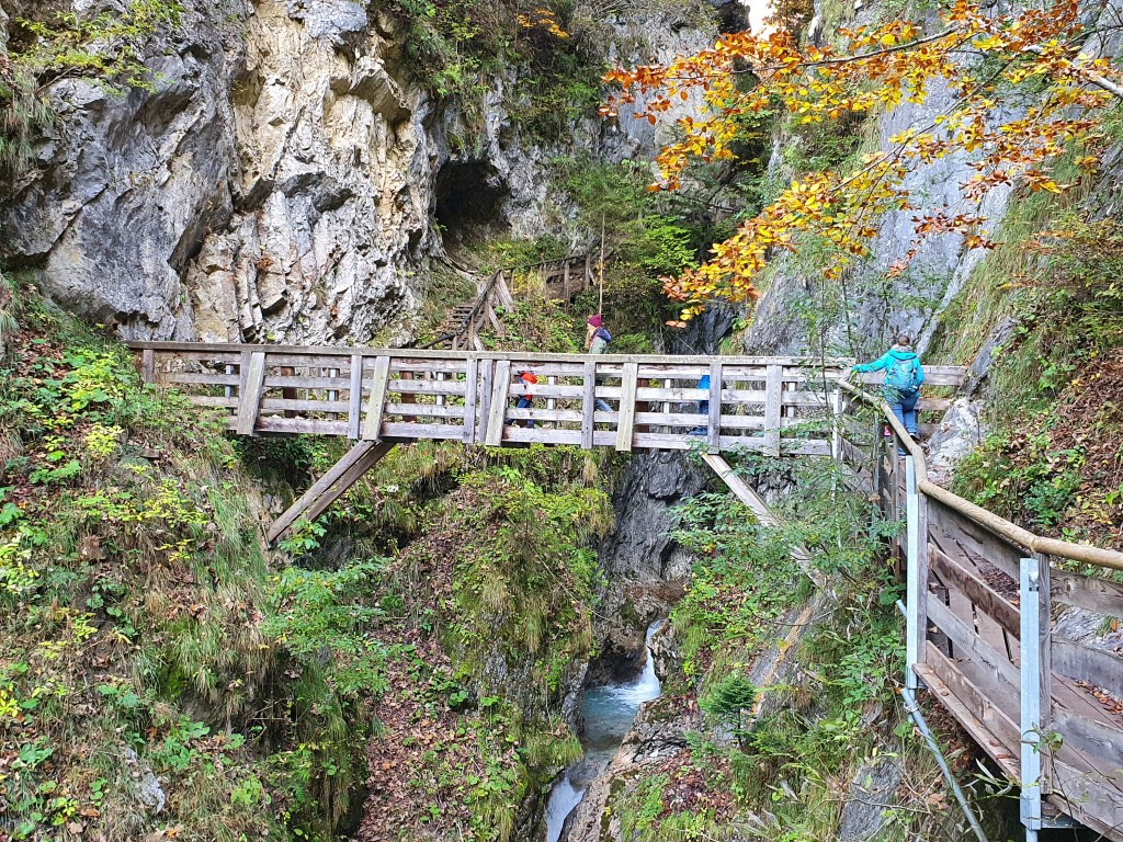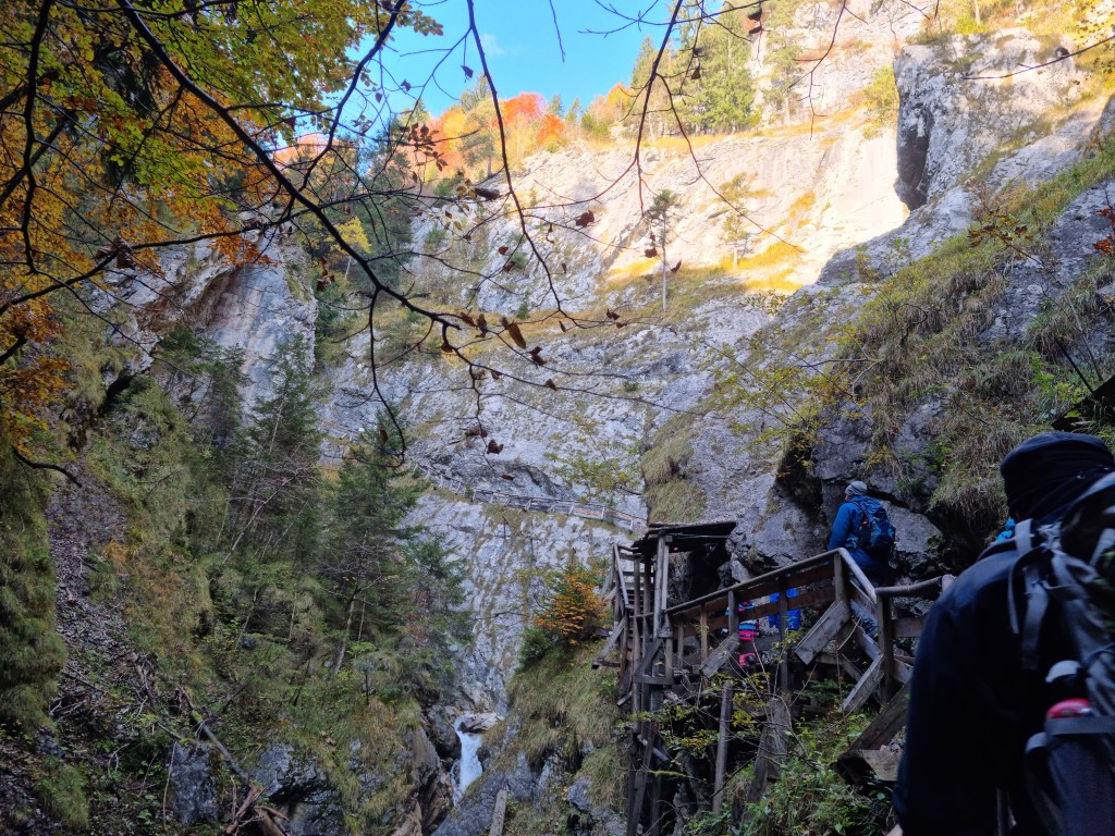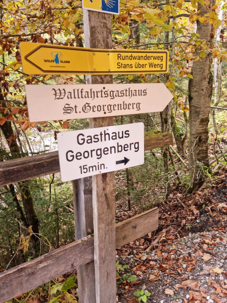Fast am Ende der Klamm angekommen, pausieren wir bei den Stana Mandln am Ufer des Stallenbachs. Der Anblick ist wirklich wunderschön. Der Herbst ist hier in allen Farben zu bewundern. Hoch über uns im Felsen thront das Benedektinerkloster St. Georgenberg. Wir überlegen gleich den Rückweg anzutreten, entscheiden uns aber dann doch den Aufstieg zum Kloster zu wagen. Die nach oben führende Straße ist ziemlich steil, wird aber durch die herrliche Herbstsonne und den besonderen Ausblick auf das Kloster belohnt. Vor allem die „Harry-Potter“ Brücke beeindruckt uns sehr. Im Kloster angekommen nehmen wir auf der Terrasse Platz. Unglaublich warm und sonnig ist es dort. Wir spüren richtig wie wir von Kraft und Energie erfüllt werden. Die Terrasse ist voll besetzt, das Personal ist aber unglaublich freundlich und flott. Wir genießen Kaspressknödelsuppe, Schnitzel und diverse Torten. Danach sind wir so voll, dass wir nicht mehr wissen, wie wir vom Berg hinuntersteigen sollen.