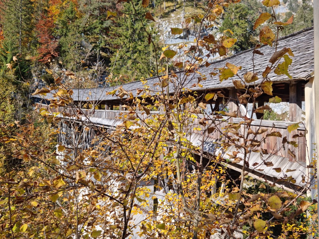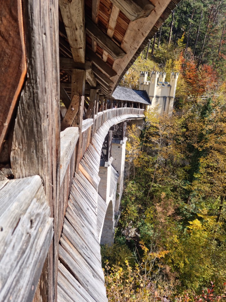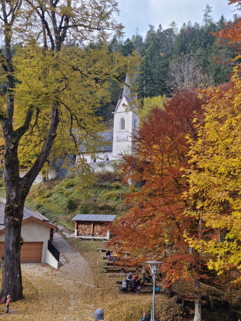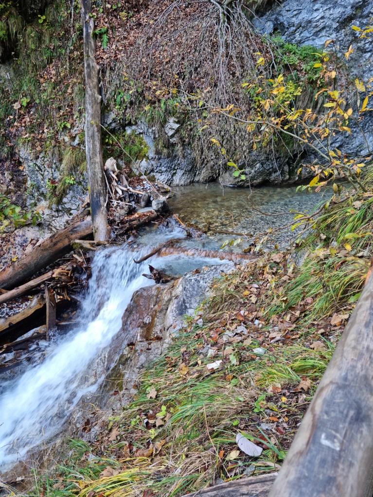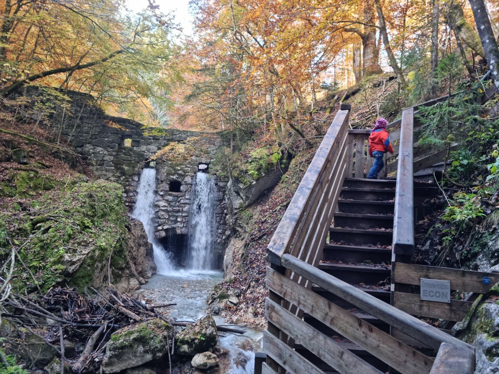Fast am Ende der Klamm angekommen, pausieren wir bei den Stana Mandln am Ufer des Stallenbachs. Der Anblick ist wirklich wunderschön. Der Herbst ist hier in allen Farben zu bewundern. Hoch über uns im Felsen thront das Benedektinerkloster St. Georgenberg. Wir überlegen gleich den Rückweg anzutreten, entscheiden uns aber dann doch den Aufstieg zum Kloster zu wagen. Die nach oben führende Straße ist ziemlich steil, wird aber durch die herrliche Herbstsonne und den besonderen Ausblick auf das Kloster belohnt. Vor allem die „Harry-Potter“ Brücke beeindruckt uns sehr. Im Kloster angekommen nehmen wir auf der Terrasse Platz. Unglaublich warm und sonnig ist es dort. Wir spüren richtig wie wir von Kraft und Energie erfüllt werden. Die Terrasse ist voll besetzt, das Personal ist aber unglaublich freundlich und flott. Wir genießen Kaspressknödelsuppe, Schnitzel und diverse Torten. Danach sind wir so voll, dass wir nicht mehr wissen, wie wir vom Berg hinuntersteigen sollen.