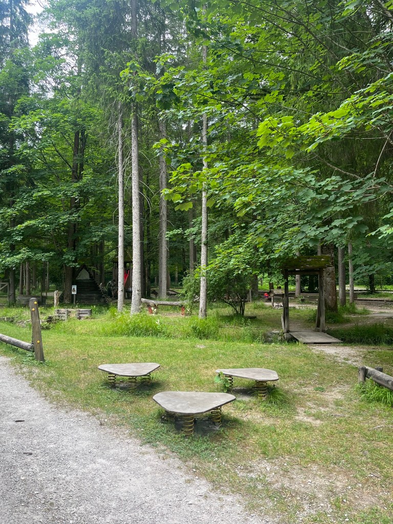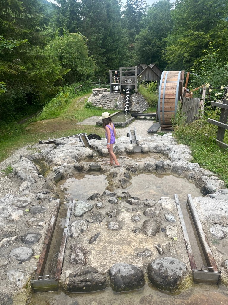Wir bezahlen den Eintrittspreis von €13,90 pro Person für einen Tageseintritt welcher, meiner Meinung nach, völlig gerechtfertigt ist und betreten das Areal, das inmitten eines Waldes neben einem Bach liegt. 1.Eindruck: Juhu viel Schatten, wow, so viele Holz-Spielgeräte und „wo fangen wir bloß an?“. Der Natuabub murmelt mit seinen 1,5 Jahren ein leises „cool“ und stapft zu ein paar Aquarien wo er begeistert Fische beobachtet. Das Natuamädl ist mit ihren derzeit 4,5 Jahren da schon etwas ungeduldiger und würde am liebsten auf der Stelle ALLES ausprobieren. In solchen Momenten erinnere ich mich manchmal an einen Satz, den meine Mama schon früher öfter sagte: “ Jedem Recht getan ist eine Kunst die niemand kann!“. Wie recht sie doch damals schon hatte. Kurz versinke ich in einem Tagtraum in dem unsere Kinder bereits Schulkinder sind, schwimmen können, und alle Aktivitäten selbstständig ausprobieren können, ich mich somit entspannt im Areal bewegen kann und die Kinder einfach zu uns kommen wenn sie etwas brauchen. Aber nein, unsere Natuakinder sind eben momentan noch recht klein und können bzw. dürfen nirgends alleine hin. In Gedanken verabschiede ich mich also von gemeinsamer Zeit mit meinem Mann weil jeder von uns immer einem Kind nachläuft und wir uns allerhöchstens bei einem Kindertausch über den Weg laufen (damit nicht immer nur er die tollen, wilden Aktivitäten mit der Großen machen darf).