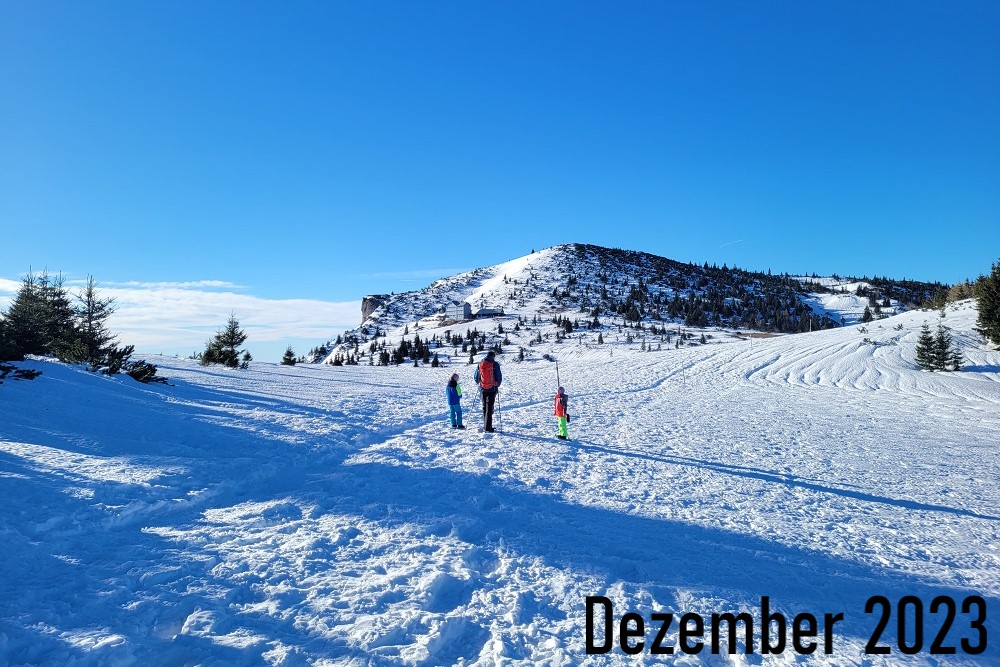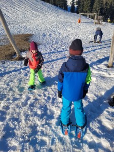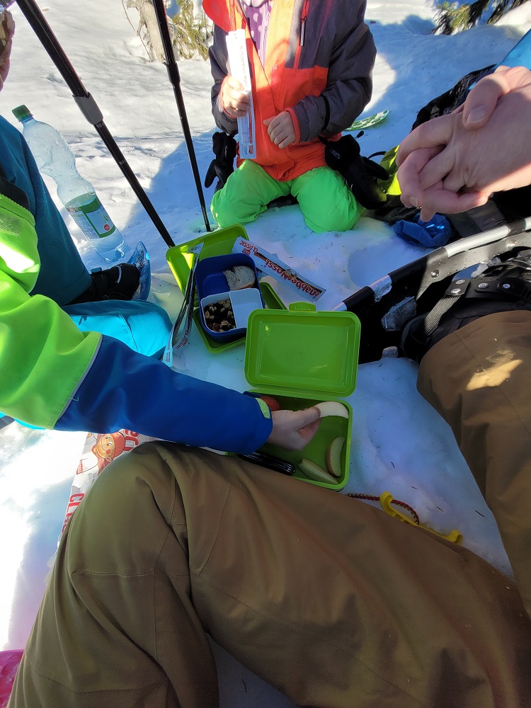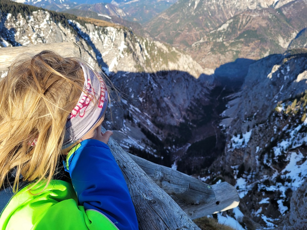 Oben angekommen schnallen wir uns alle die Schneeschuhe an. Unsere Natuakinda sind sofort begeistern. Laufen den ersten Hügel hinauf und rutschen am Hintern wieder herunter. Skistöcke benötigen sie nicht. Wir machen uns auf den Weg zum Ottohaus. Entlang des Weges suchen wir uns immer wieder einen Hügel zum Rutschen. Der Schnee ist so gefroren, dass man den Bob kaum braucht. Nach einer guten Stunde kommt das Ottohaus in Sicht. Wir machen noch einen Abstecher zum Höllentalblick. Damit überfordern wir die Natuakinda ein wenig. Wir machen ein Picknick mitten im Schnee. Mit genügend Tee, Quetschies, Nüssen und Semmeln steigt die Laune schließlich wieder.