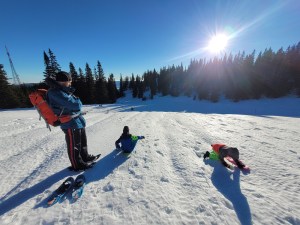 Zusätzlich zu den Tickets buchen wir noch Schneeschuhe für unsere beiden Natuakinda (6 und 8 Jahre alt).