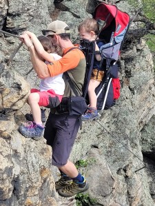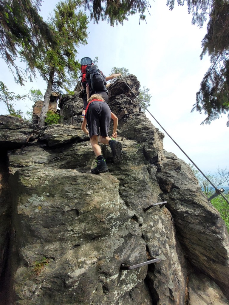Danach geht es nach links den Grat entlang bis zur Hirschwand. Um hinauf zu gelangen sollte man unbedingt schwindelfrei und absolut trittsicher sein!!! Meine Tochter fühlte sich damals ziemlich unbehaglich, daher ist nur mein Sohn über die hintere Hirschwand über den Steig hinuntergeklettert. Natürlich gemeinsam mit meinem Mann. Man sollte wirklich vorsichtig sein und sich hier nicht übernehmen. Ein Klettersteigset benötigt man keines, man könnte sich aber im Stahlseil versichern, falls man das möchte.