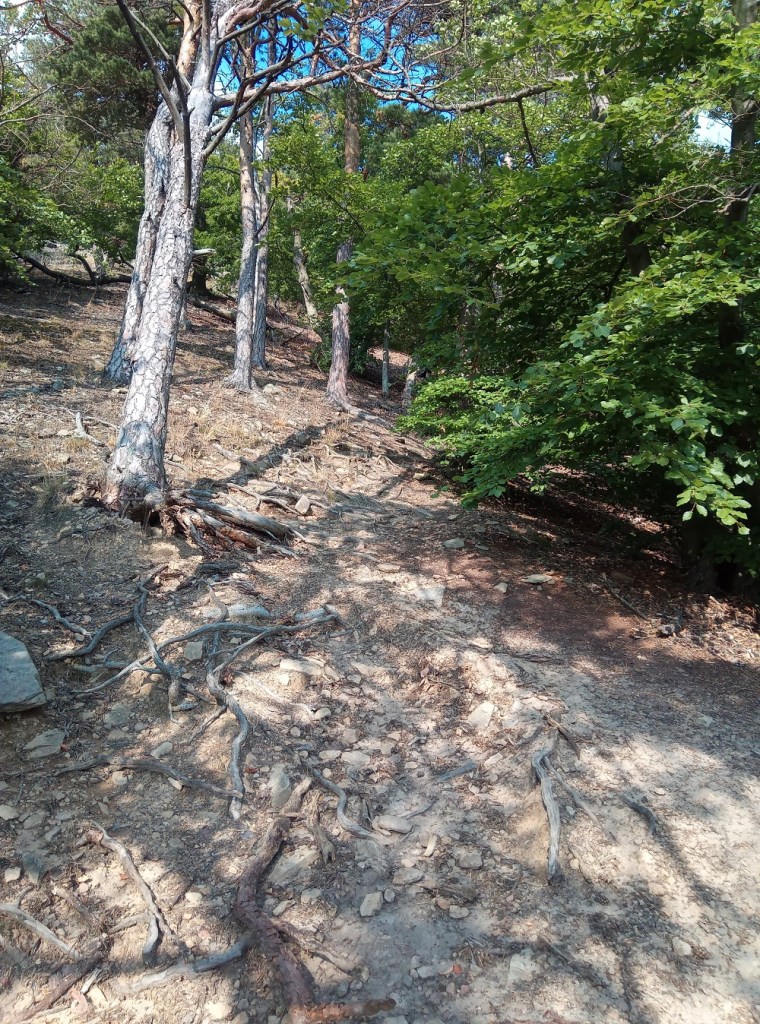 Wir lassen die Hirschwand hinter uns zurück und wandern den Grat weiter. Von nun an geht es mehrheitlich bergab. Der Kiefernwald erinnert mich jedes Mal an unsere Urlaube in Kroatien. Auch im Frühling kann es in der Sonne hier richtig warm werden, weil sich Feld und Sandboden so stark erwärmen … für mich ein herrliches Gefühl.