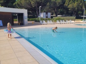 Nach kurzer Spielzeit erkunden wir ein wenig den Campinplatz. Gleich bei der Rezeption liegt ein sehr modernes offenes Restaurant. Die Speisekarte ist den Wünschen von Familien stark angepasst. Es gibt Hühnernuggets, Burger, Pizza & Co. Davor liegt ein großer moderner Pool mit Sonnenliegen, die man kostenlos nutzen kann. Wir entscheiden uns dazu kurz in den Pool zu springen. Danach packen wir unseren Rucksack und wandern an den Strand. Räder wären hier sicherlich von Vorteil. Zum Strand geht man ca. 15 Minuten. Das ist aber wirklich machbar. Am Weg kommt man auch an einem kleinen Spielplatz vorbei. Außerdem hat man auf so einem Campingplatz immer viel zu entdecken… verschiedene Zelte, Wohnmobile, Anhänger … das ist schon immer faszinierend.