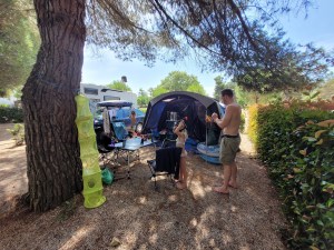 Wie jedes Jahr starten wir unseren Urlaub gegen 3 Uhr früh. Die Natuakinda werden schlafend ins Auto gesetzt. Gepackt wird am Vortag. Mit einer Kaffeepause kommen wir zwischen 8 und 9 Uhr im Stella Maris Campingplatz Umag an. Der Verkehr ist zu dieser Nachtzeit überschaubar. Wir haben Glück und unsere Parzelle ist gleich fertig zum Beziehen. Allerdings haben wir einen Platz direkt neben dem Klohaus zugewiesen bekommen. Wir inspizieren den Campingplatz auf Ausschau nach einem besseren Zeltplatz: in kurzer Gehdistanz zum Klo und der Waschküche, aber so weit weg, dass man in der Nacht nicht belästigt wird. Außerdem sollte man immer auf den Sonnenstand und Bäume in der näheren Umgebung achten. Mit etwas Glück kann man dann auch eine Hängematte aufhängen. Beim Zelten muss man unbedingt auch auf den Untergrund achten. Niemand will auf einer Baumwurzel oder einem fetten Stein schlafen. Wir überlegen auch immer wie wir das Zelt am besten ausrichten und wohin wir unseren Otto parken.